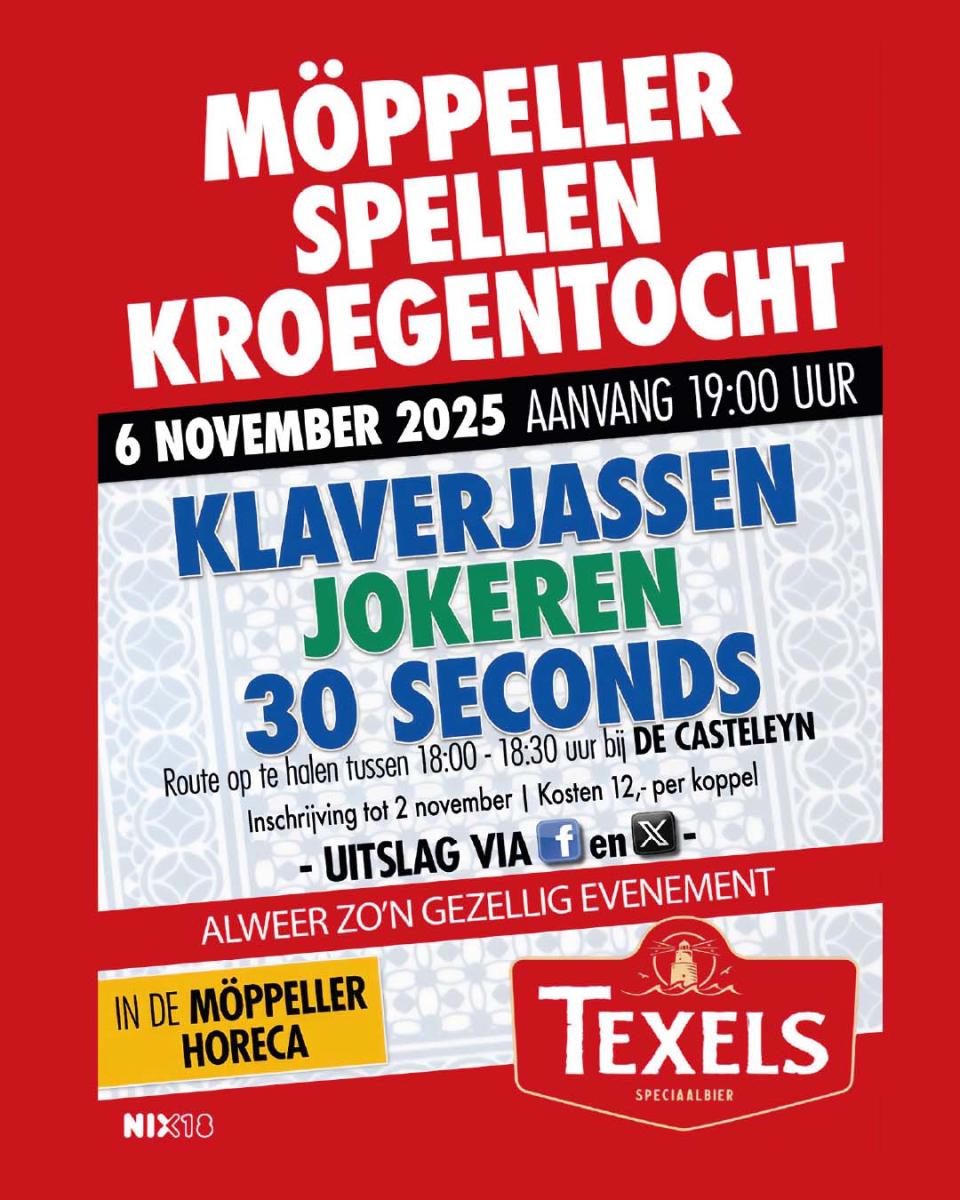 Het wordt een avond vol spelletjes, gezelligheid en plezier tijdens de Möppeller Spellen Kroegentocht op donderdag 6 november. In teams van twee trekken deelnemers langs verschillende kroegen, waar er wordt geklaverjast, gejokerd en 30 Seconds gespeeld.