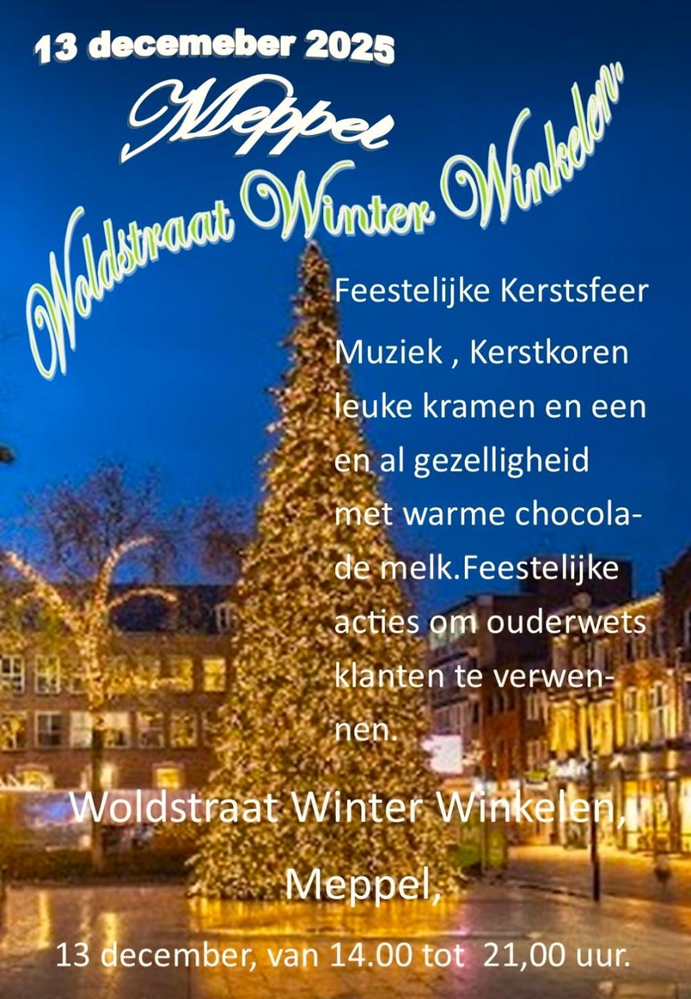 13 december 2025 is het een beetje "Kerstmarkt" in Meppel. In de Woldstraat wordt alles in kerstsfeer gehuld en verzorgd. Meer informatie volgt.