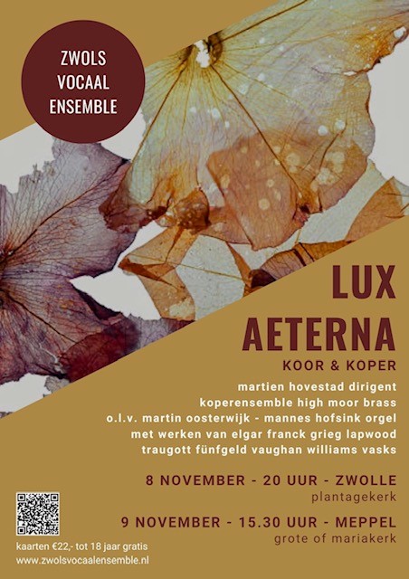 In Lux Aeterna -rond Elgars gelijknamige werk- versmelten koor, koper en orgel tot een klankrijk geheel dat straalt, ademt en ontroert door schoonheid alleen. Van Francks feestelijke Psalm 150 tot Fünfgelds kleurrijke Symphonische Suite: levendige energie en ritme worden afgewisseld met momenten van serene rust in muziek van Grieg, Vasks, Lapwood en Vaughan Williams. De sprankelende Finale van Fünfgeld en Amy Beach' Peace I leave you brengen een afsluiting vol stilte en bezinning. Medewerking wordt verleend door koperensemble High Moor Brass o.l.v. Martin Oosterwijk en Mannes Hofsink (orgel). Het geheel staat onder leiding van Martien Hovestad.