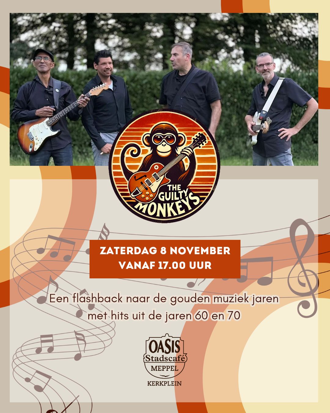Op 8 november halen we de gouden jaren 60's & 70's terug bij het vernieuwde deel van Stadscafé Oasis! The Guilty Monkeys zorgen voor goede live muziek, sfeer en herkenbare hits vanaf 17.00 uur!