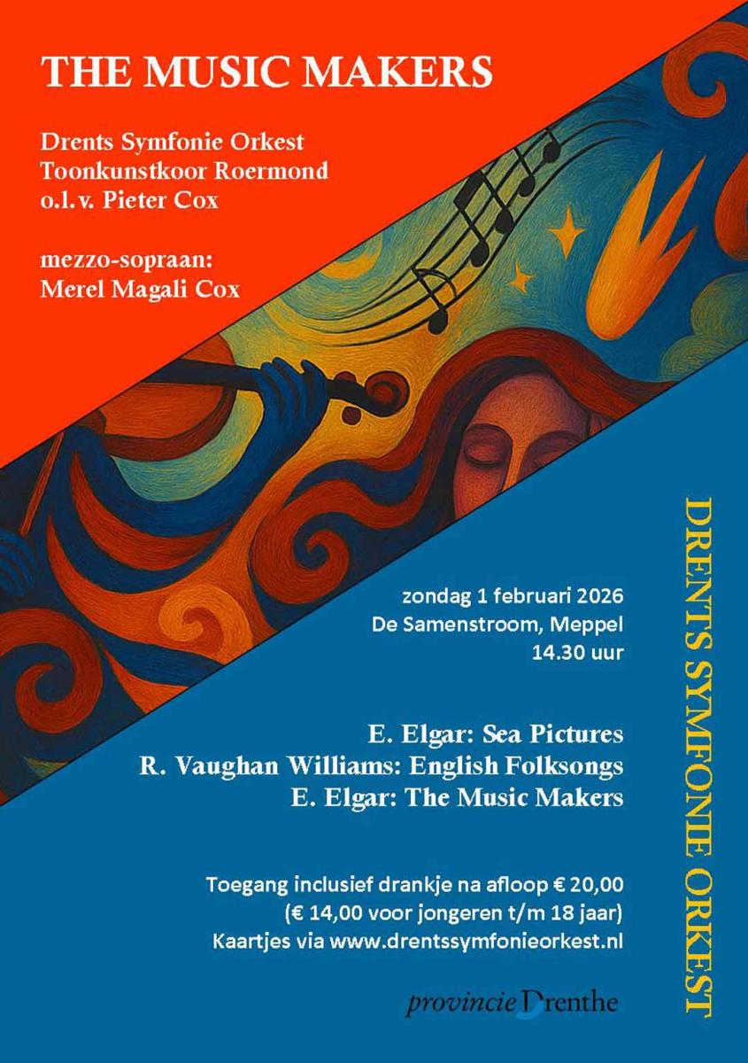 Het Drents Symfonie Orkest speelt samen met het Toonkunstkoor Roermond een bijzonder concert in De Samenstroom. Op het programma staat zelden uitgevoerde muziek, met The Music Makers en Sea Pictures van Elgar, aangevuld met de Folk Songs Suite van Vaughan Williams.
