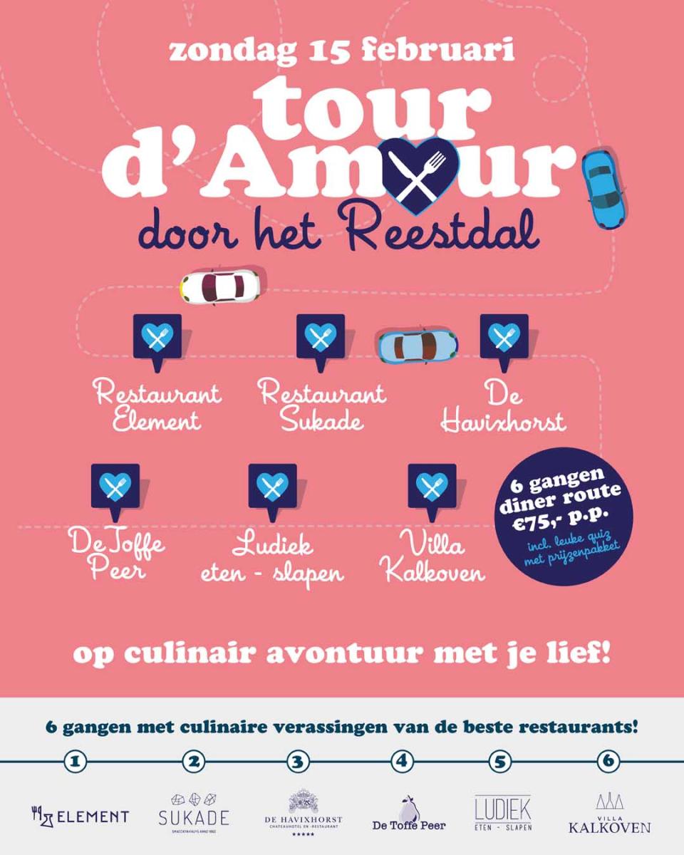 Stap samen in de auto en beleef een romantische roadtrip door het prachtige Reestdal tijdens Tour d’Amour. Onderweg wachten zes zorgvuldig geselecteerde restaurants op jullie, waar jullie kunnen genieten van heerlijke gerechten en bijzondere smaakervaringen. Het perfecte Valentijnsuitje om samen te proeven, te ontdekken en herinneringen te maken – ook geschikt voor vegetariërs.