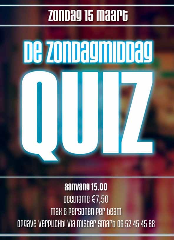 De pubquiz is op zondagmiddag 15 maart, aanvang 15.00 uur, deelname €7,50. Aanmelden verplicht en een team mag uit maximaal 6 personen bestaan.