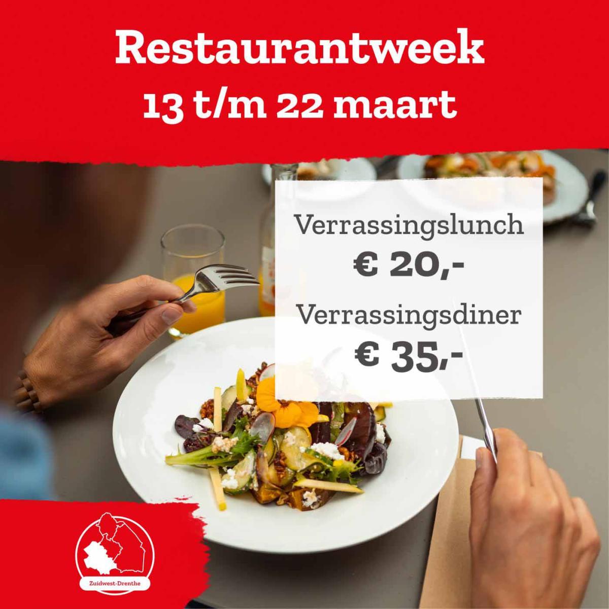 Ontdek de culinaire charme van Zuidwest‑Drenthe tijdens de Restaurantweek! Gedurende deze week kun je bij deelnemende restaurants genieten van een 2‑gangen lunch (€20) of een 3‑gangen diner (€35) voor een vaste prijs, de ideale kans om nieuwe smaken en lokale horeca te ontdekken.