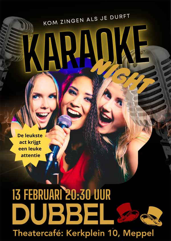 Op vrijdag 13 februari is het tijd voor Karaoke Night: pak de microfoon, zing je favoriete nummer of moedig mee aan. Gezellig, laagdrempelig en vol plezier in hartje Meppel. Start: 20.30 uur.