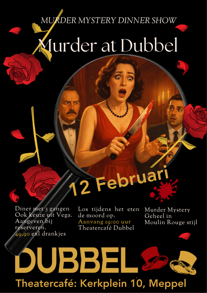 Op donderdag 12 februari beleef je het spannende Murder Mystery Diner: een 3-gangendiner vol geheimen, flamboyante personages en een moord die opgelost moet worden. Durf jij de dader aan te wijzen? Beperkte plaatsen, reserveren via www.kinderentheatercafedubbel.nl.