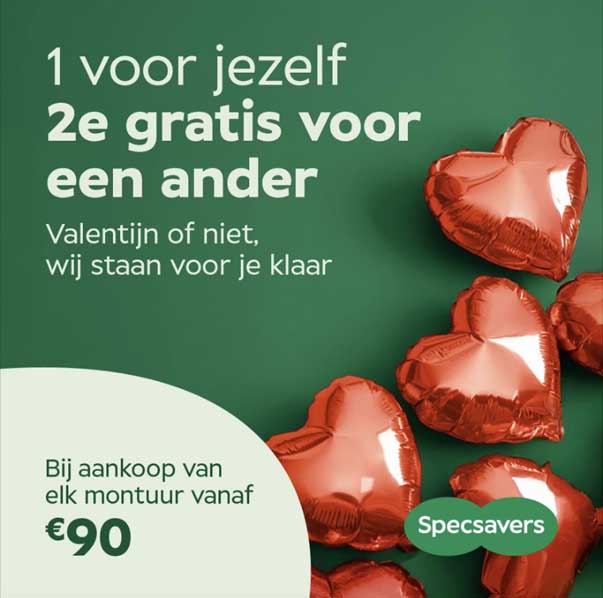 Liefde is delen, ook je bril. Bij Specsavers krijg je bij aankoop van een montuur vanaf €90 nu een tweede bril gratis voor iemand anders.