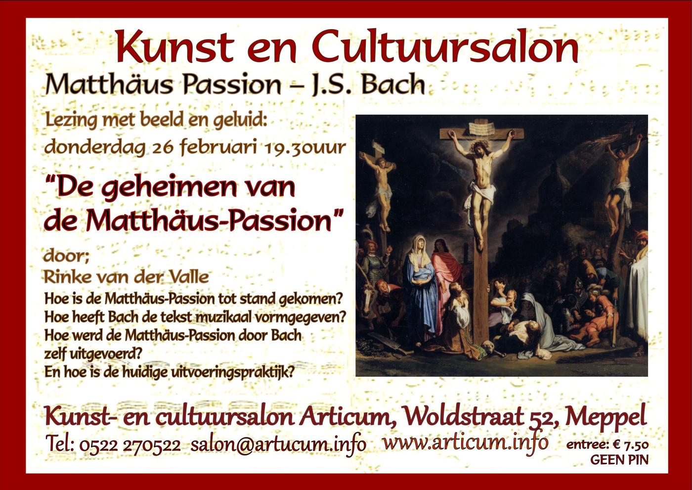 Lezing "De geheimen van de Matthäus-Passion" door Rinke van der Valle. Het is een ingewikkeld stuk dat is ontstaan in een tijd die ver achter ons ligt. De bewondering voor dit meesterwerk van Bach wordt nog groter als je meer over de achtergronden weet van dit stuk. Met beeld - en geluidsfragmenten een beeld schetsen hoe de Matthäus-Passion is opgebouwd en hoe Bach de teksten omzet in bijpassende muziek. In de lezing komen vragen aan de orde als: