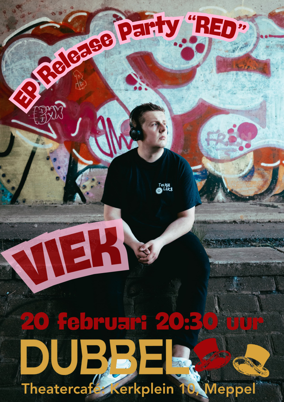 Op 20 februari brengt de Meppelse VIEK zijn debuut EP uit, genaamd 'RED'! Om dit te vieren houdt hij die dag een release party in Theatercafé Dubbel. VIEK zal een akoestische set spelen waarin alle nummers van de EP voorbij komen, en misschien nog wel meer! De avond wordt geopend door daannveldkamp ft. emmadina.music. Na het optreden van VIEK is het tijd voor een feestje! Voel je vrij om ter ere van 'RED' iets roods aan te trekken, maar da's natuurlijk niet verplicht!
