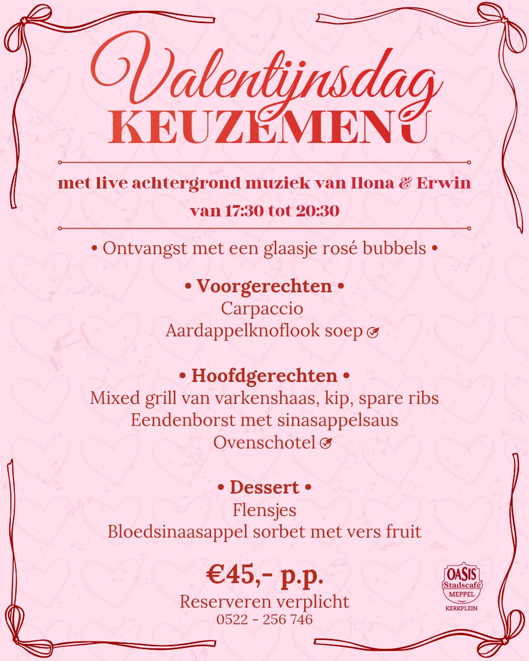Geniet samen van een romantisch Valentijnsdag Keuzemenu met live achtergrondmuziek van Ilona & Erwin.