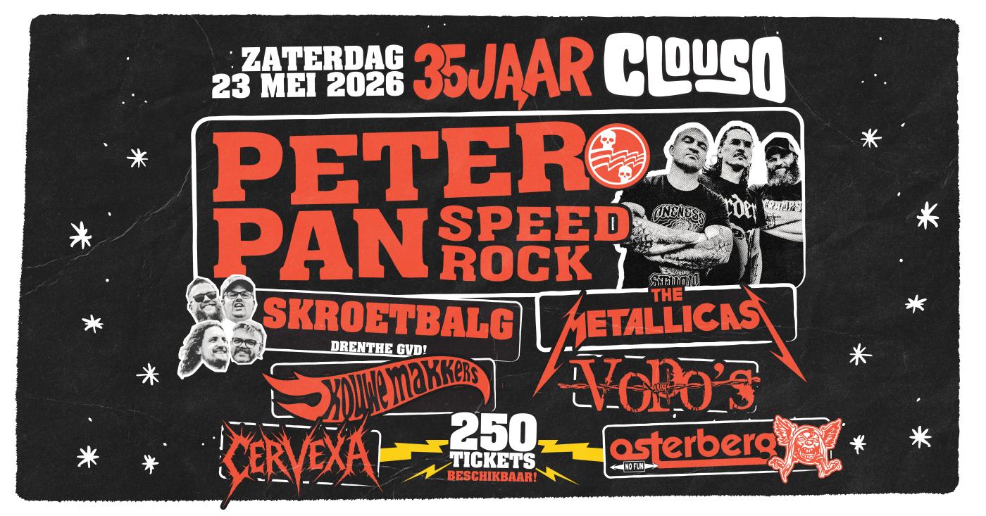 Clouso bestaat in 2026 vijfendertig jaar en dat vieren we met een show van jewelste! Samen met Skroetbalg, VOPO'S, The Metallica's, Cervexa, Kouwe makkers en Osterberg komt PETER PAN SPEEDROCK de tent vakkundig afbreken!