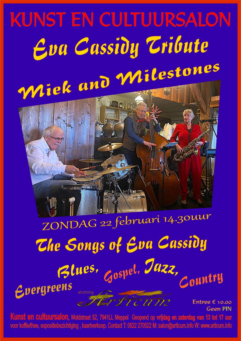 Optreden van het trio "Miek and Milestones" met hun nieuwste programma "The songs of Eva Cassidy. Drie muzikanten met hart voor jazz en een passie voor pure, eerlijke muziek brengen. Annemiek Zijlstra, een vertrouwd gezicht in de noordelijke jazzscene, Jaap Hengeveld (contrabas) en Leo Roodhof (drums. Deze middag een ode aan Eva Cassidy. Een zangeres die pas na haar overlijden wereldberoemd werd - liet een indrukwekkend repertoire achter vol emotie, puurheid en muzikaliteit. In dit programma nemen wij u mee naar haar laatste muzikale jaar (ze is maar 33 jaar oud geworden): een prachtige mix van blues, jazz, gospel, country en evergreens, met hier en daar een speelse knipoog naar Toots Thielemans.
