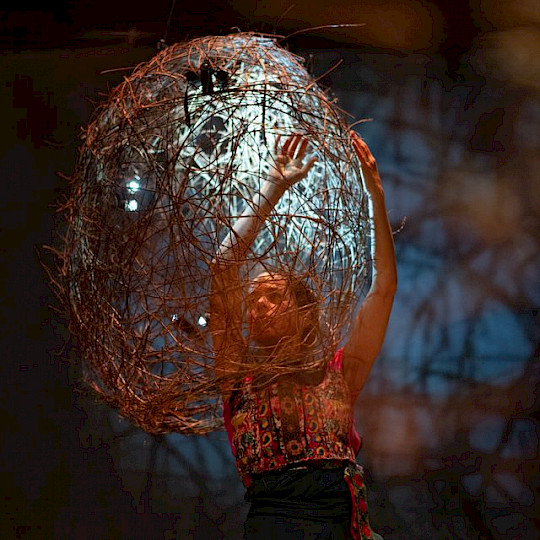 In Vlechtwerk ontmoeten we twee mensen. Een zingende vrouw die met haar klanken de wereld omhult. En een vlechtende vrouw. Uit de zakken van haar rok komen licht en schaduwen, vogels en vissen, takken en twijgen. Alles wat ze vindt, vervlecht ze in haar verhaal. Ze schept en schept, tot ze erachter komt dat wat je schept, ook door jou verzorgd wil worden.